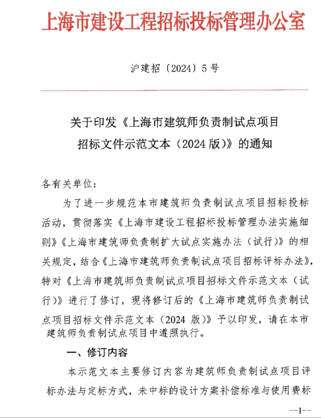 上海市建设工程招标投标管理办公室《关于印发<上海市建筑师负责制试点项目招标文件示范文本(2024版)>的通知》