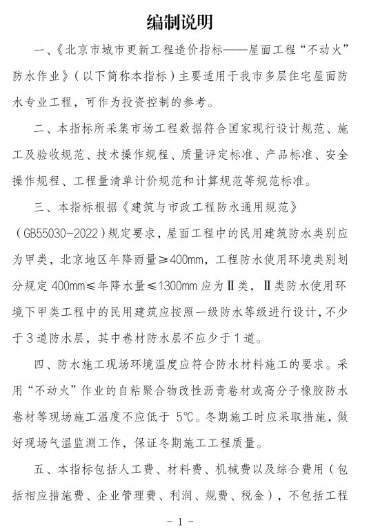 北京市住房和城乡建设委员会发布《北京市城市更新工程造价指标——屋面工程“不动火”防水作业》