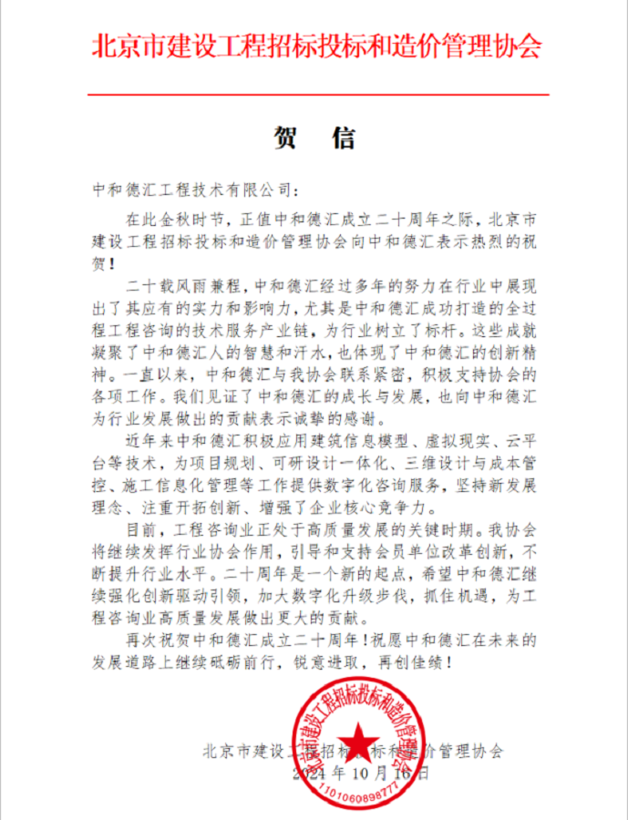 2024年1016日,正值中和德汇成立20周年之际,公司又收到了北京市建设工程招标投标和造价管理协会的热烈祝贺。这封贺信不仅是对我们过去20年辛勤付出和卓越成就的肯定,更是对我们未来发展提出了更高的期望。我们将全力以赴在京标价协工作指导下,积极参与行业合作,提升技术创新能力,为业主提供更加优质的服务,共同为推动工程咨询行业的健康发展贡献力量。