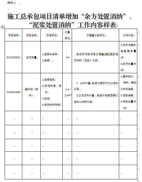 附件:1.施工总承包项目清单增加“余方处置消纳”、“泥浆处置消纳”工作内容样表