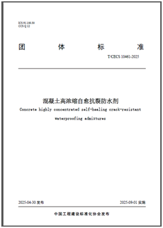 近日,由公司产品研发中心参编的团体标准《混凝土高浓缩自愈抗裂防水剂(T/CECS 10461-2025)》正式发布,自2025年9月1日起实施。