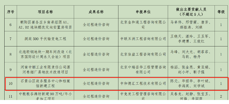 在2025年度北京市建设工程招标投标及造价成果文件等级评定中,我公司承揽的石景山区政务服务中心和档案馆新建工程荣获“全过程造价成果类”一级奖项!北京东南高速公路智慧物流港项目(一期)施工准备阶段工程荣获“清单最高投标限价成果类”二级奖项!